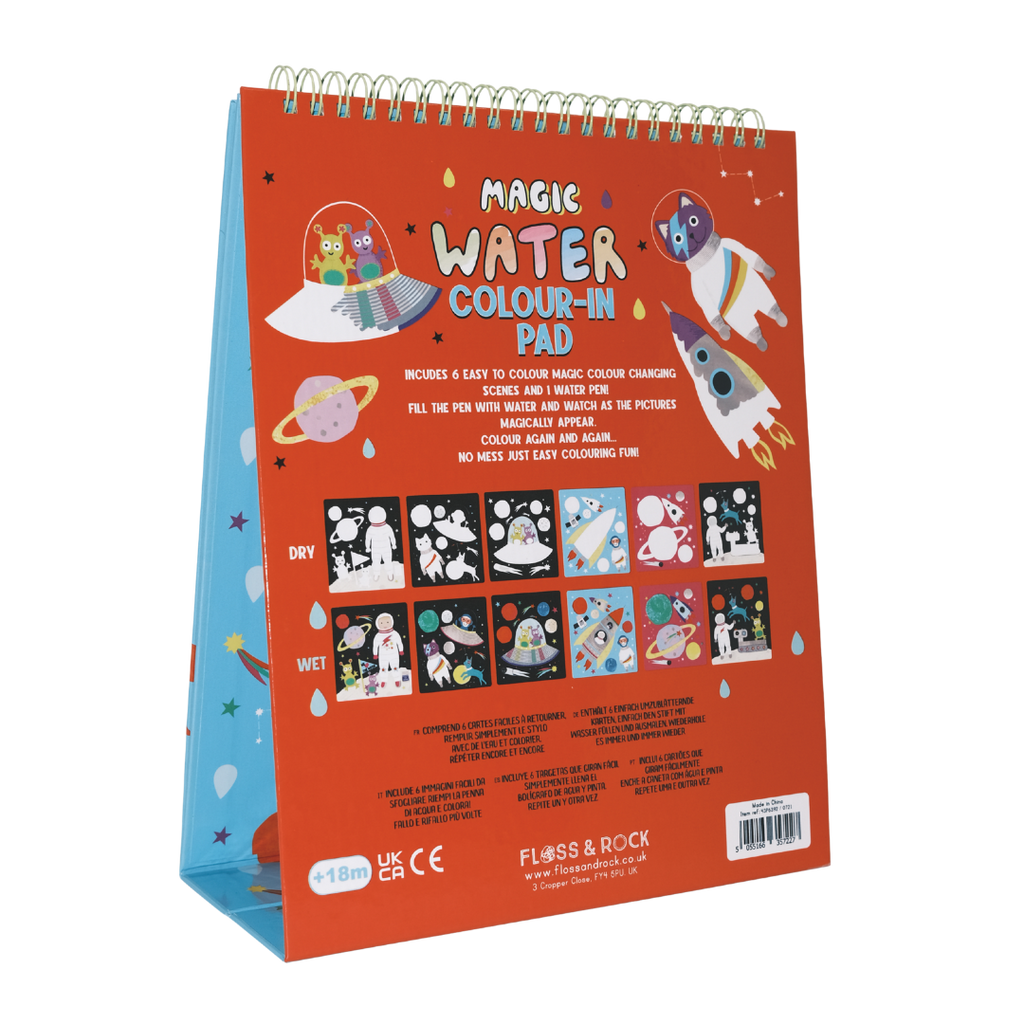 Our Magic Water Easel Pads are so much fun! Like our popular water cards, fill up the pen with water and colour in the designs to see them magically appear, then disappear once dry. The 6 brightly coloured fun sheets are held together in a spiral bound pad allowing you to flip them over once complete. The built-in easel stands the pad up so you can use it like a ‘proper’ artist! The pad is reusable over and over again and you’ll have so much fun revealing the colourful space people, aliens, planets, shooting stars and much more! Once you’ve finished your creative session, close the pad and secure your special water pen in the elastic closure to keep it nice and safe. This portable pad is perfect for taking out and about (and you don’t have to worry about any mess either!)