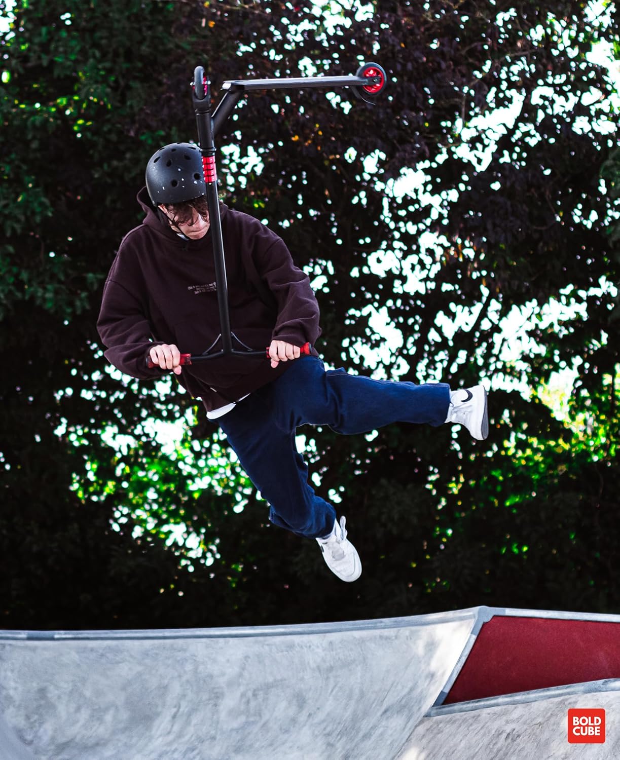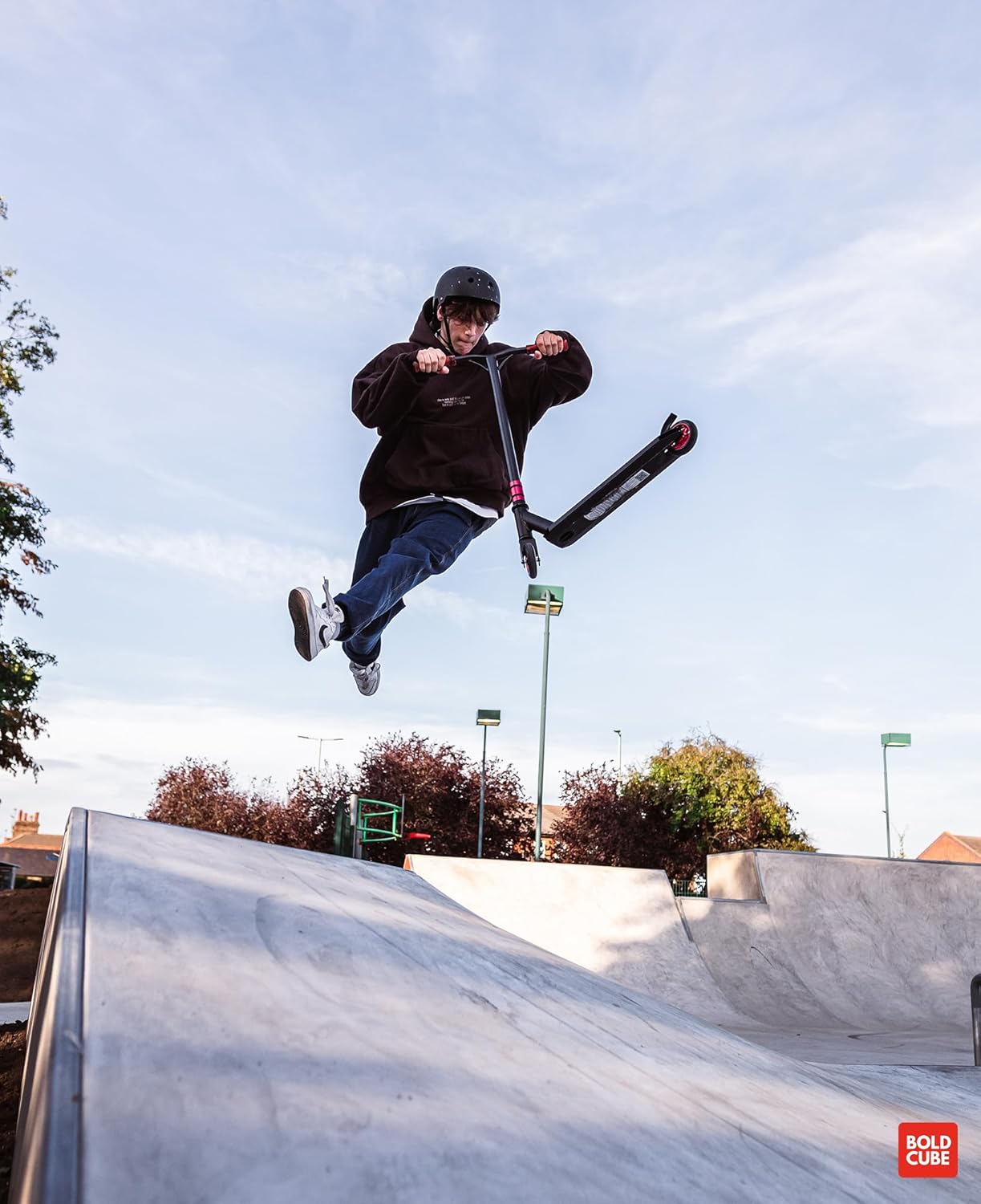 Designed for curious skate park first timers, experience a taste of the stunt scooter life without breaking the bank. Our Deluxe Stunt Scooter offers full 360 rotation, with a high volume micro crystallised gripped deck in a variety of stand out styles. The Skatepark is your oyster with this cool, hard wearing scooter that features a lightweight aluminium deck for easy deck spins with a tough steel handlebar. Material where it matters, ideal for a budding trickster that’s looking to nail their first trick. The Deluxe Stunt Scooter is fitted with more premium components for a slick entry into scooting.