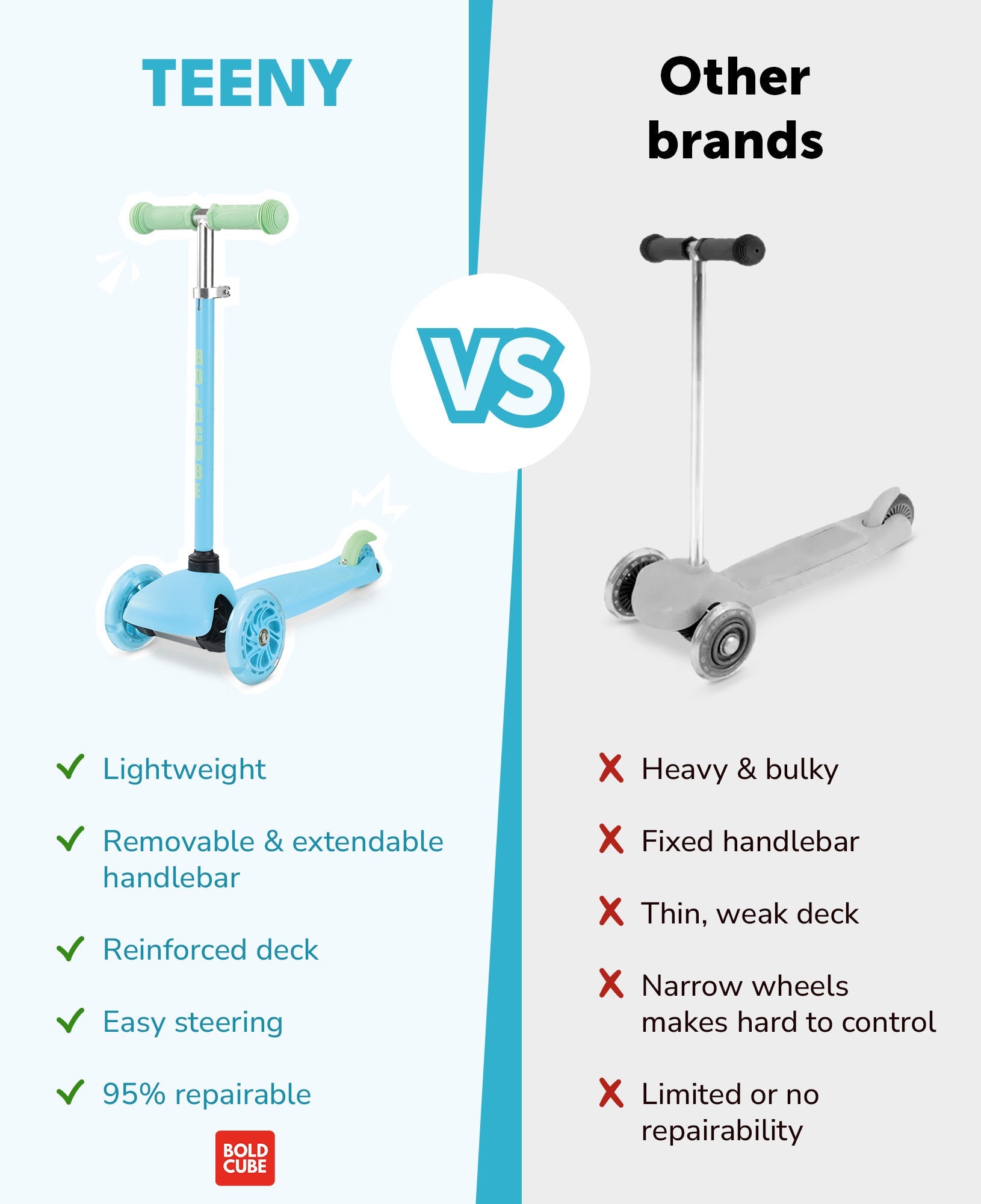 Our Teeny 3 Wheel Scooter was designed with early riders in mind, between 2-5 years old. It’s the ideal first scooter for any courageous toddler who wants to get to grips with scooting. It’s directed by lean to steer which means it’s the most intuitive way of movement for eager little ones to get scooting with speed quickly. The super lightweight (but sturdy!) frame means little kids kick off to scoot with ease, and carry their ride independently to wherever their next adventure may be!